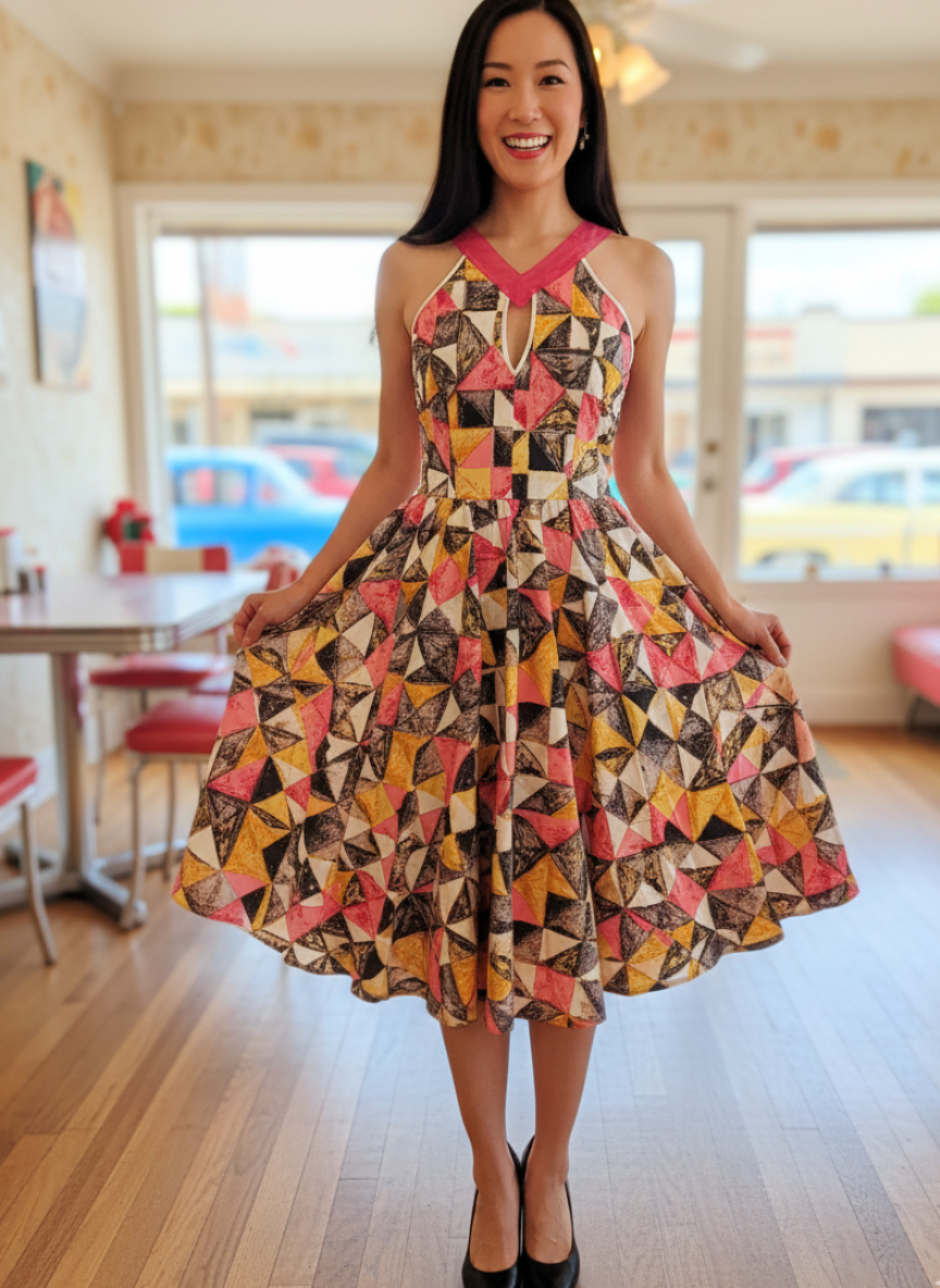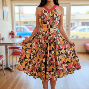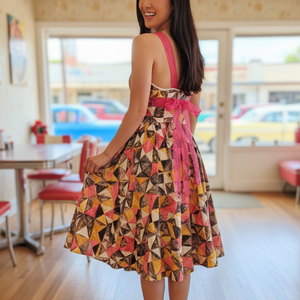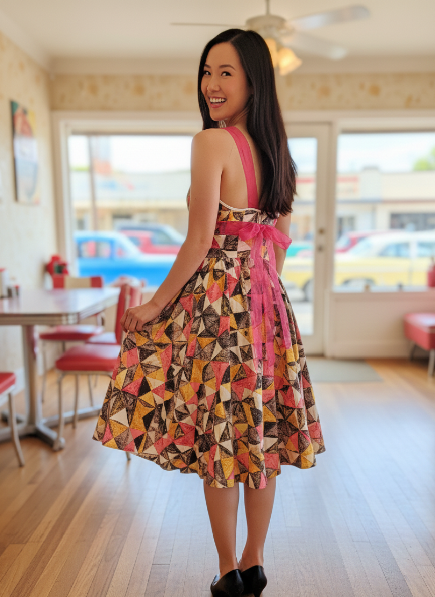 Beautiful, full circle skirt with bright colors and a pink taffeta bow make this sample dress fun and flirty!
