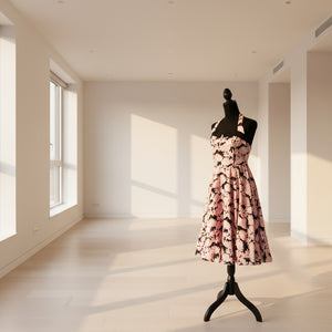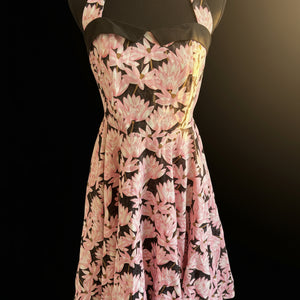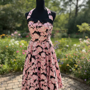 Pink and black floral halter dress, back zip, tie neck, A-Line skirt