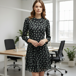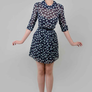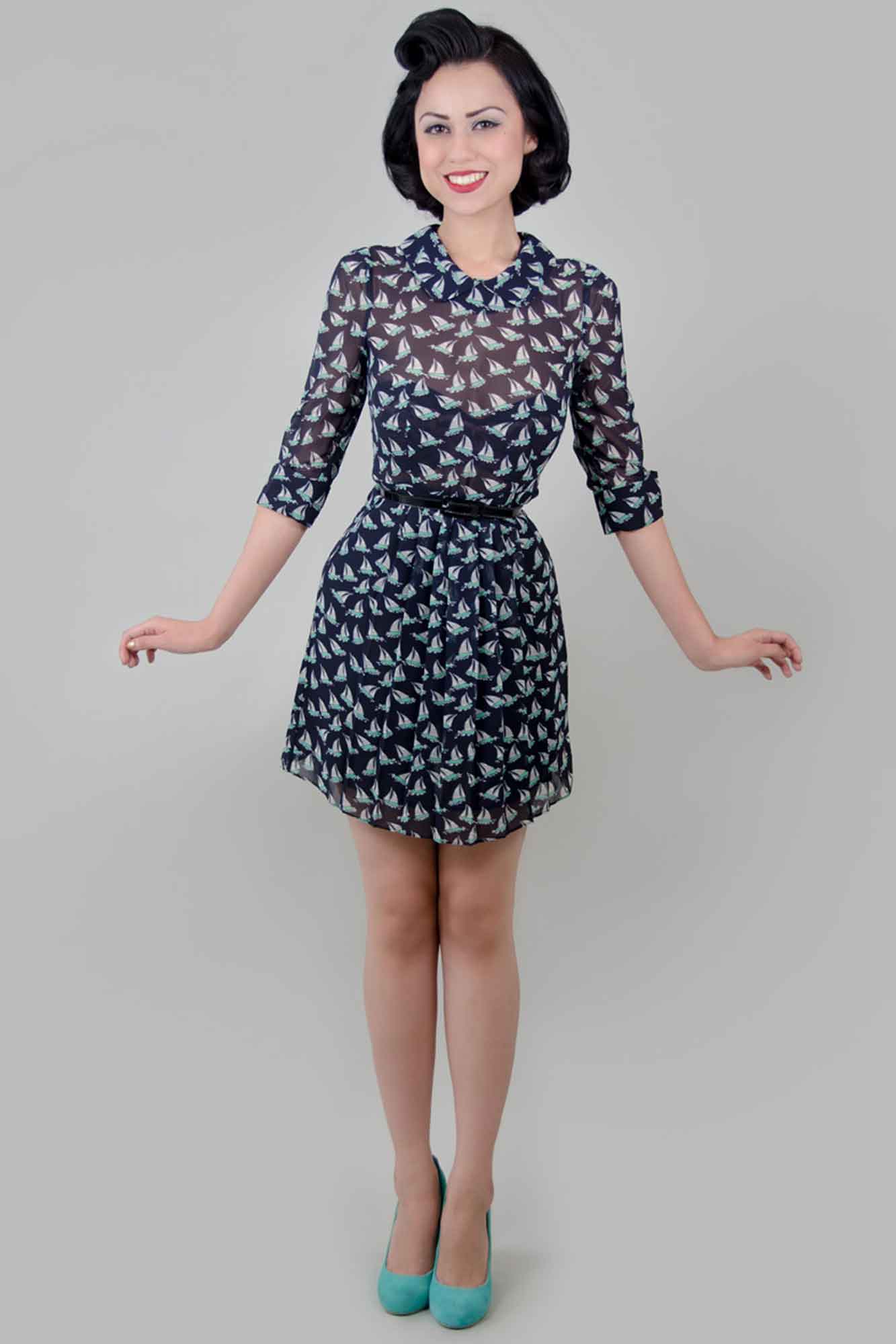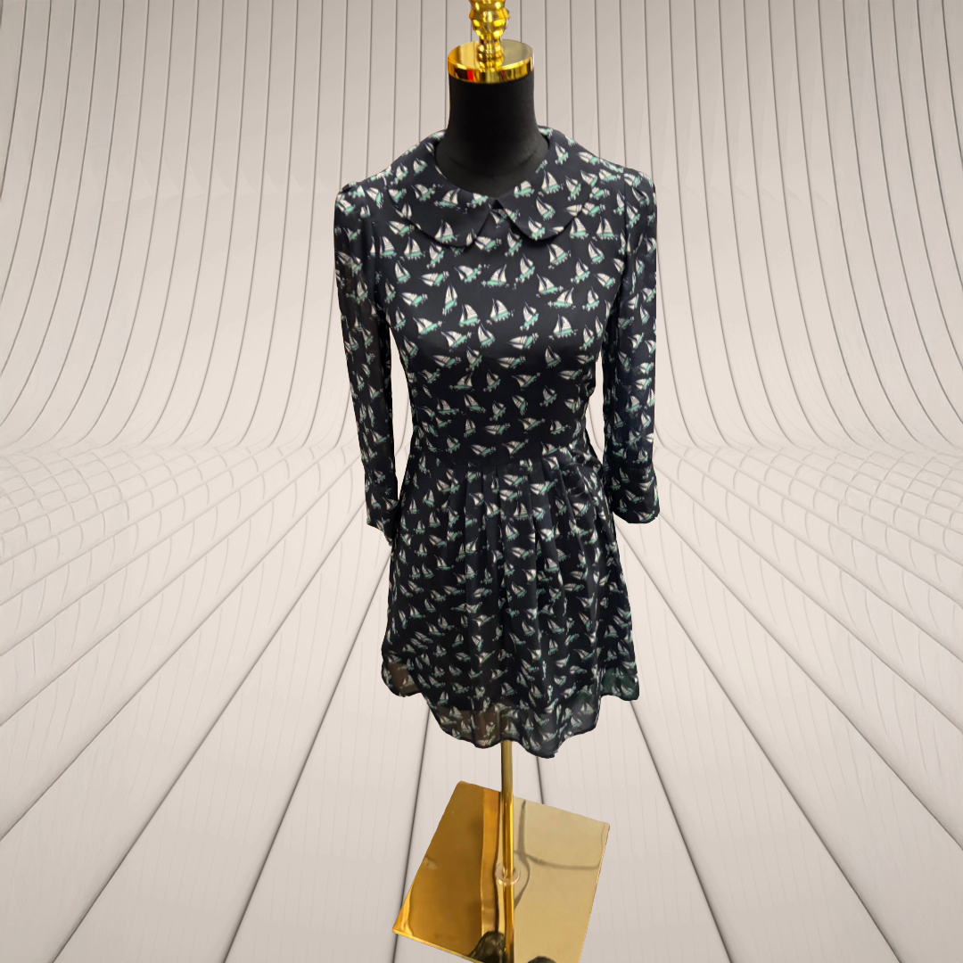 Navy Blue Background with Aqua and white sail boat pattern. Long sleeves, back zip, fit and flare skirt.