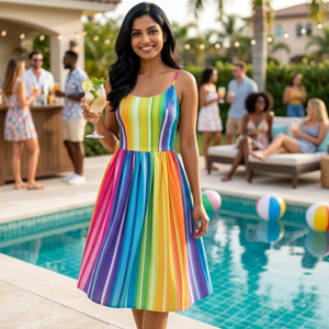 Prepare to twirl wrapped in a rainbow! Our popular Gloria dress in  gorgeous, eye catching stripes.