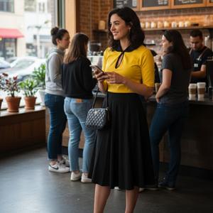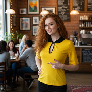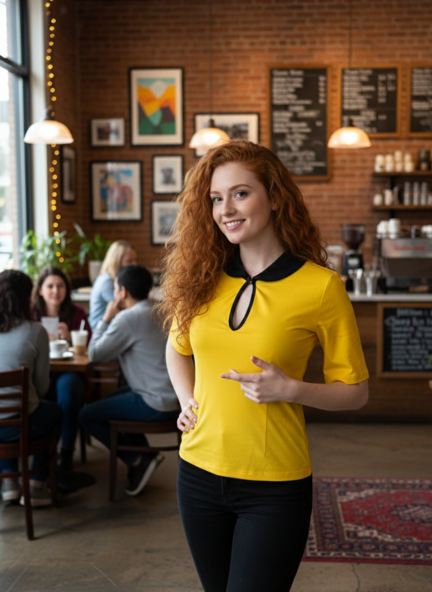Sample - Never made. Our Best selling Keynote Blouse in Marigold with a sharp black collar and trim.