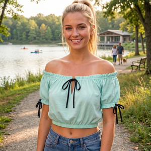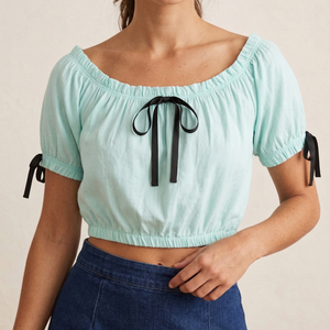 Wear off or on the shoulder, this peasant top in light Aqua cotton with black ribbon ties at the neck and sleeve. Pair with skirts or capris for a genuine 1950's vibe.