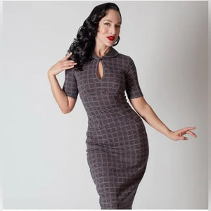 Audrey wiggle dress is inspired by the 1940's and is fitted in a stretch poly knit for comfort and durability. The functional button at the neck leaves you the option for different necklines to suit your mood.