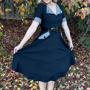 The Trixie Dress effortlessly captures the iconic mid-century silhouette with its full circle skirt, a defining feature that guarantees you that fabulous fifties look. The dress cinches at the waist, accentuating your curves and creating that coveted hourglass figure that was synonymous with the era.